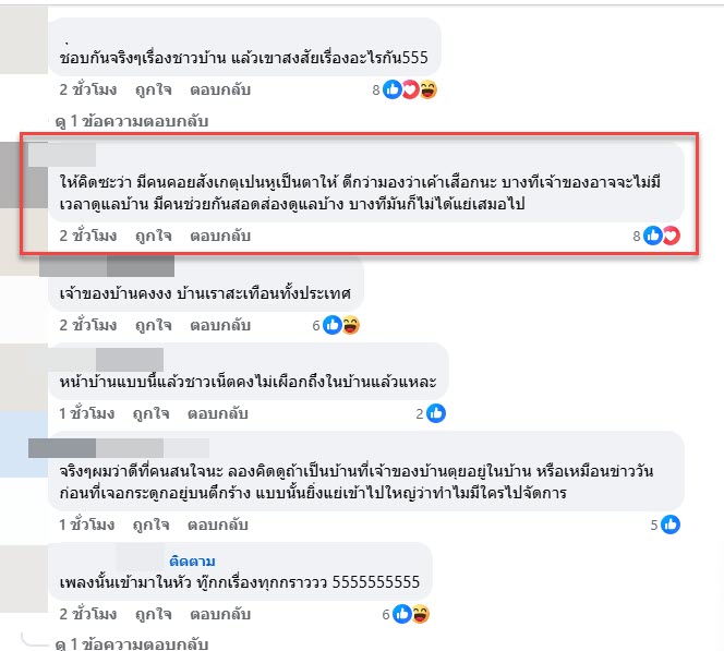 จากคลิปนี้ก็มีหลายคนเข้ามาแสดงความคิดเห็นกันอย่างมากมายทั้งบอกว่า”ให้คิดซะว่า มีคนคอยสังเกตุเปนหูเป็นตาให้ ดีกว่ามองว่าเค้าเสือกนะ บางทีเจ้าของอาจจะไม่มีเวลาดูแลบ้าน มีคนช่วยกันสอดส่องดูแลบ้าง บางทีมันก็ไม่ได้แย่เสมอไป”