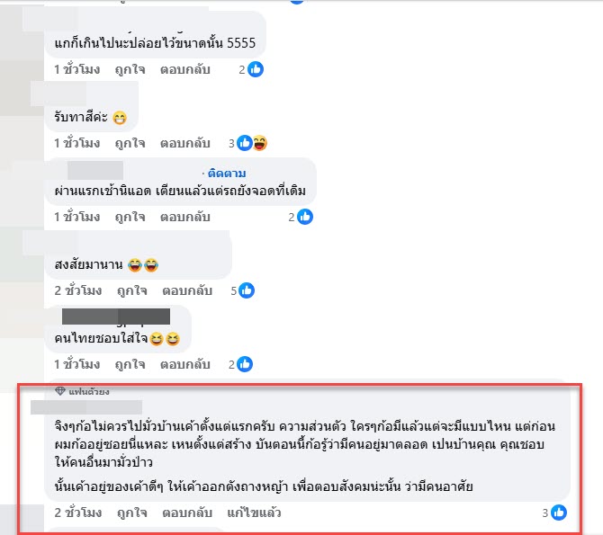 “จิงๆก้อไม่ควรไปมั่วบ้านเค้าตั้งแต่แรกครับ ความส่วนตัว ใครๆก้อมีแล้วแต่จะมีแบบไหน แต่ก่อนผมก้ออยู่ซอยนี่แหละ เหนตั้งแต่สร้าง บันตอนนี้ก้อรู้ว่ามีคนอยู่มาตลอด เปนบ้านคุณ คุณชอบให้คนอื่นมามั่วป่าว นั้นเค้าอยู่ของเค้าดีๆ ให้เค้าออกตังถางหญ้า เพื่อตอบสังคมน่ะนั้น ว่ามีคนอาศัย”