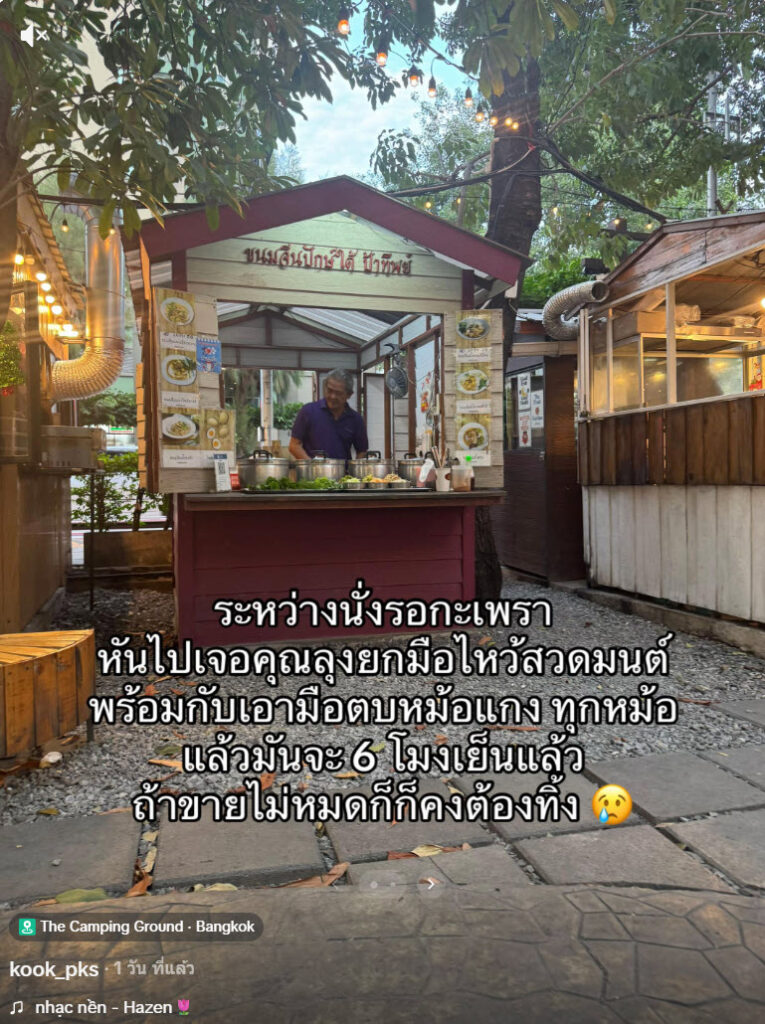 ปกติไม่ชอบกินขนมจีนเลย เพราะไม่ชอบกินแกงกะทิแต่..ระหว่างนั่งรอกะเพราหันไปเจอคุณลุงยกมือไหว้สวดมนต์พร้อมกับเอามือตบหม้อแกง ทุกหม้อ แล้วมัน จะ 6 โมงเย็นแล้ว ถ้าขายไม่หมดก็คงต้องทิ้ง