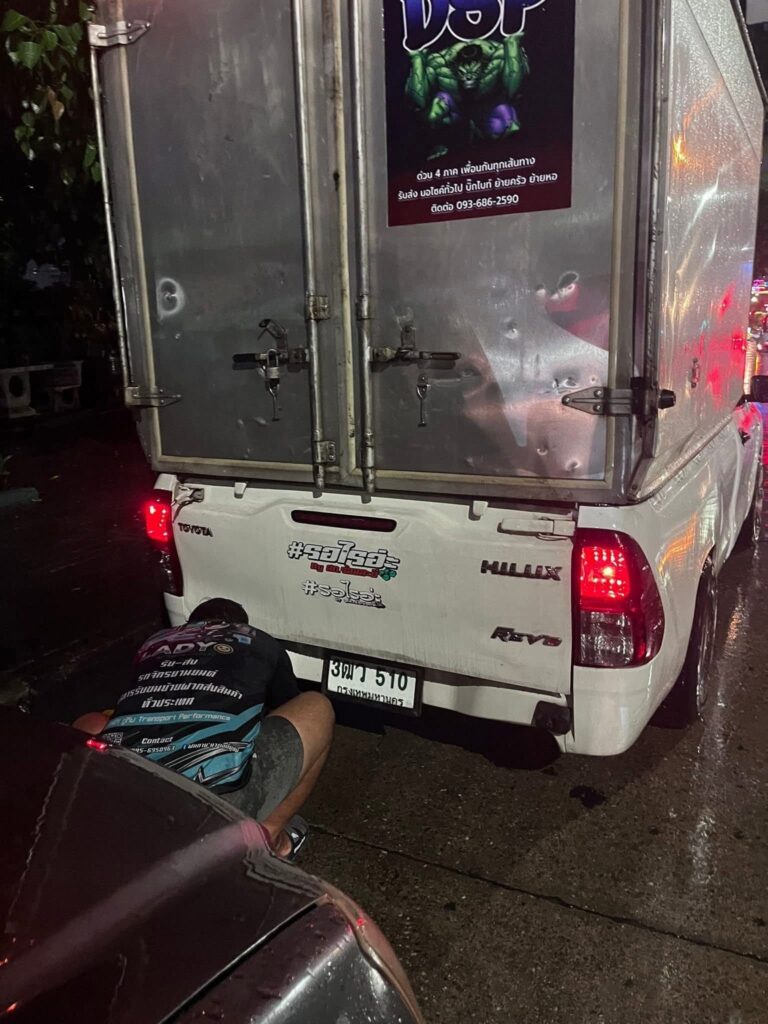 ณ ตอนนั้นทุกคันรีบฝนก็ตก หมดหนทาง พี่ผูชายคนนี้ได้จอดรถหน้ารถผมตอนไหนไม่ทันมอง แกเปิดไฟขอทางแล้วบอกเดี่ยวจากลากลงจากมอเตอร์เวย์ให้ ผมเลยวางสายจากตำรวจ บนหลังรถกะบะของแกก็กำลังจะเอาของเต็มหลังรถไปส่งลูกค้า แกลงมาตากฝนแล้วหาเชือกเผื่อที่จะลากรถผม