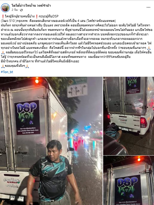 ใครรู้จักผู้ชายคนนี้บ้าง กระบะตู้ทึบDSP (3ฒว 510 )กรุงเทพ คือผมรถเสียกลางมอเตอร์เวย์ที่เป็น 4 เลน (ไดร์ชาจพังแบตหมด) ฝนก็ตก รถทุกคันต่างคนต่างรีบ บีบแตร เพราะรถติด ตอนนั้นหมดหนทางคิดอะไรไม่ออก รถดับไฟไม่มี ได้โทรหาตำรวจ