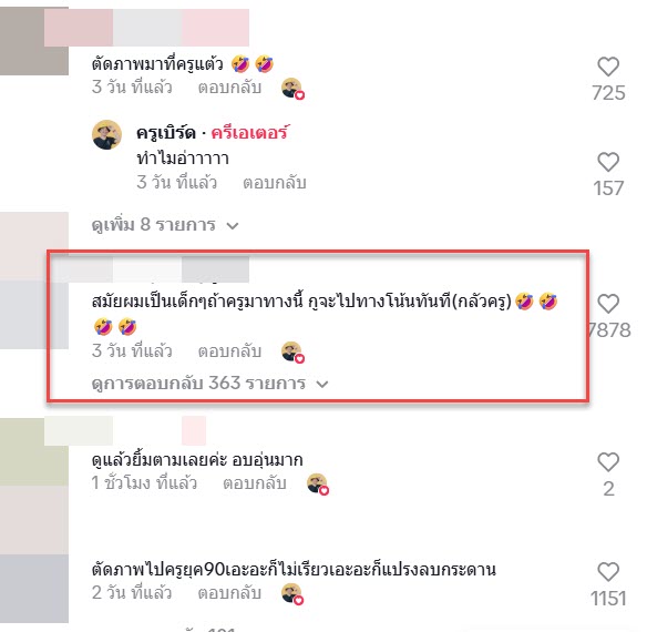 จากคลิปนี้ก็มีหลายคนเข้ามาแสดงความคิดเห็นกันอย่างมากมาย”สมัยผมเป็นเด็กๆถ้าครูมาทางนี้ กูจะไปทางโน้นทันที(กลัวครู)”