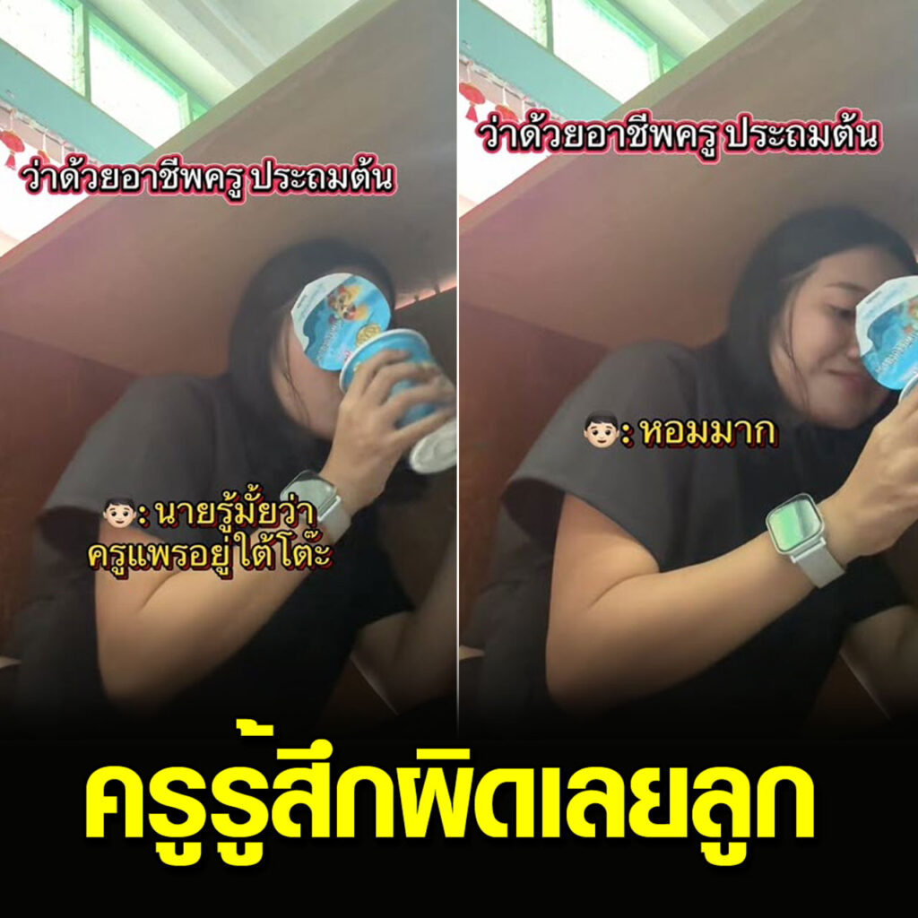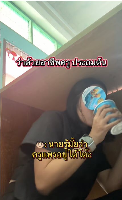 ซึ่งจากในคลิปนี้ก็ได้เผยให้เห็นว่าคุณครูที่กำลังแอบกินมาม่าอยู่ใต้โต๊ะ แล้วมีเสียงเด็กพูดขึ้นมาว่า “นายรู้มั้ยว่าครูแพรอยู่ใต้โต๊ะ แล้วก็ตอบกลับมาว่า รู้ อย่าปาก หอมมาก กะให้คุณครูกินเป็นสุขแน่”