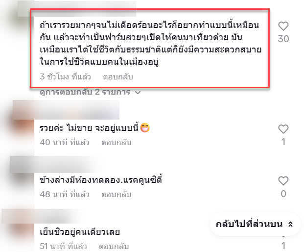 “ถ้าเรารวยมากๆจนไม่เดือดร้อนอะไรก็อยากทำแบบนี้เหมือนกัน แล้วจะทำเป็นฟาร์มสวยๆเปิดให้คนมาเที่ยวด้วย มันเหมือนเราได้ใช้ชีวิตกับธรรมชาติแต่ก็ยังมีความสะดวกสบายในการใช้ชีวิตแบบคนในเมืองอยู่”