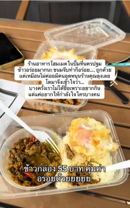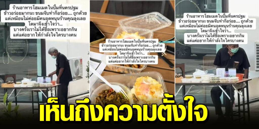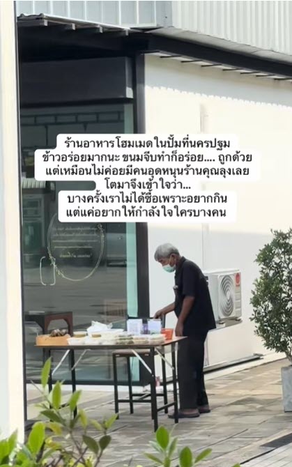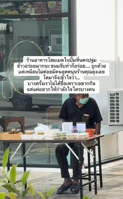 โดยจากโพสต์นั้นได้ระบุว่า “ร้านอาหารโฮมเมดในปั้มที่นครปฐม ข้าวอร่อยมากนะ ขนมจีบทำก็อร่อย ถูกด้วย แต่เหมือนไม่ค่อยมีคนอุดหนุนร้านคุณลุงเลย โตมาจึงเข้าใจว่า บางครั้งเราไม่ได้ซื้อเพราะอยากกิน แต่แค่อยากให้กำลังใจใครบางคน”