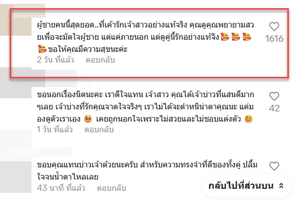“ผู้ชายคนนี้สุดยอด..ที่เค้ารักเจ้าสาวอย่างแท้จริง คุณดูคุณพยายามสวยเพื่อจะมัดใจผู้ชาย แต่แค่ภายนอก แต่ดูคู่นี้รักอย่างแท้จิงขอให้คุณมีความสุขนะคะ”
