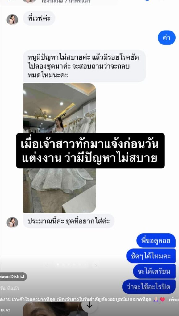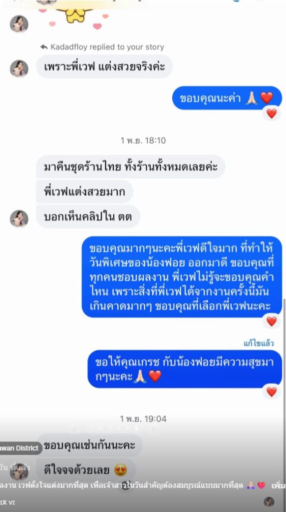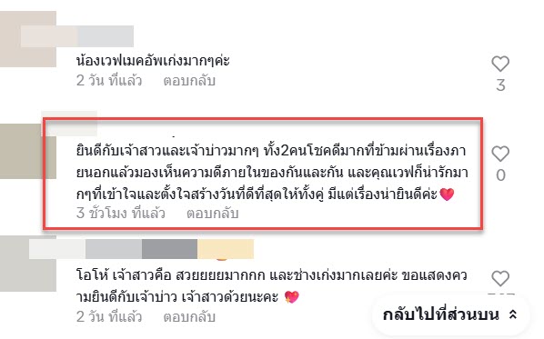 “ยินดีกับเจ้าสาวและเจ้าบ่าวมากๆ ทั้ง2คนโชคดีมากที่ข้ามผ่านเรื่องภายนอกแล้วมองเห็นความดีภายในของกันและกัน และคุณเวฟก็น่ารักมากๆที่เข้าใจและตั้งใจสร้างวันที่ดีที่สุดให้ทั้งคู่ มีแต่เรื่องน่ายินดีค่ะ”