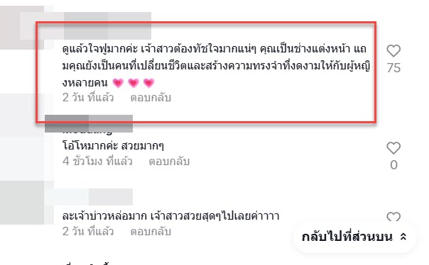 “ดูแล้วใจฟูมากค่ะ เจ้าสาวต้องทัชใจมากแน่ๆ คุณเป็นช่างแต่งหน้า แถมคุณยังเป็นคนที่เปลี่ยนชีวิตและสร้างความทรงจำที่งดงามให้กับผู้หญิงหลายคน “