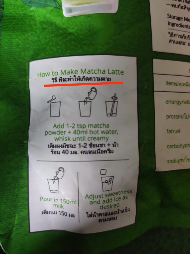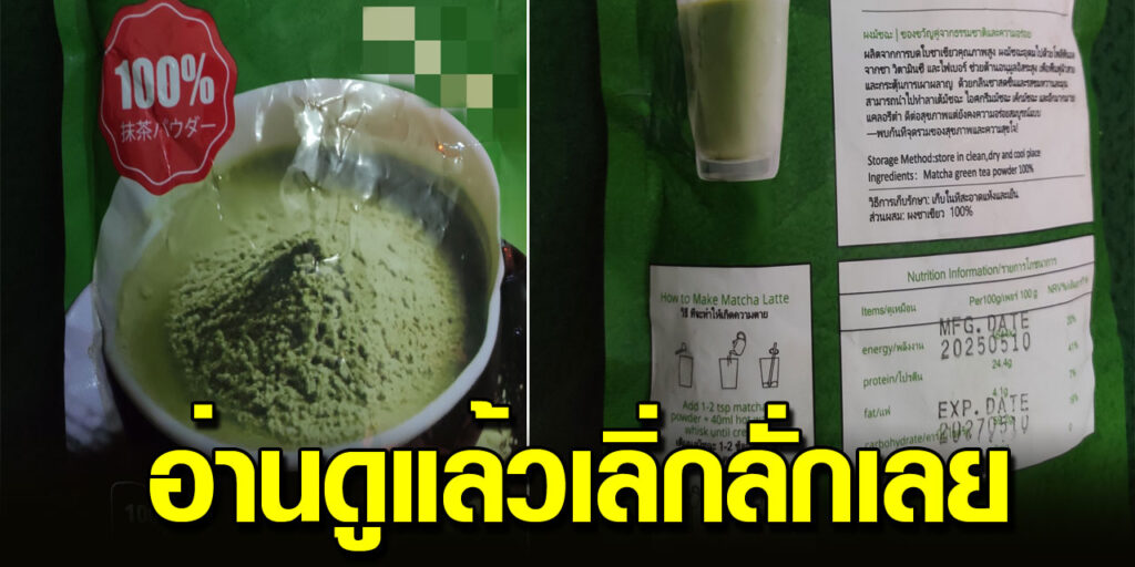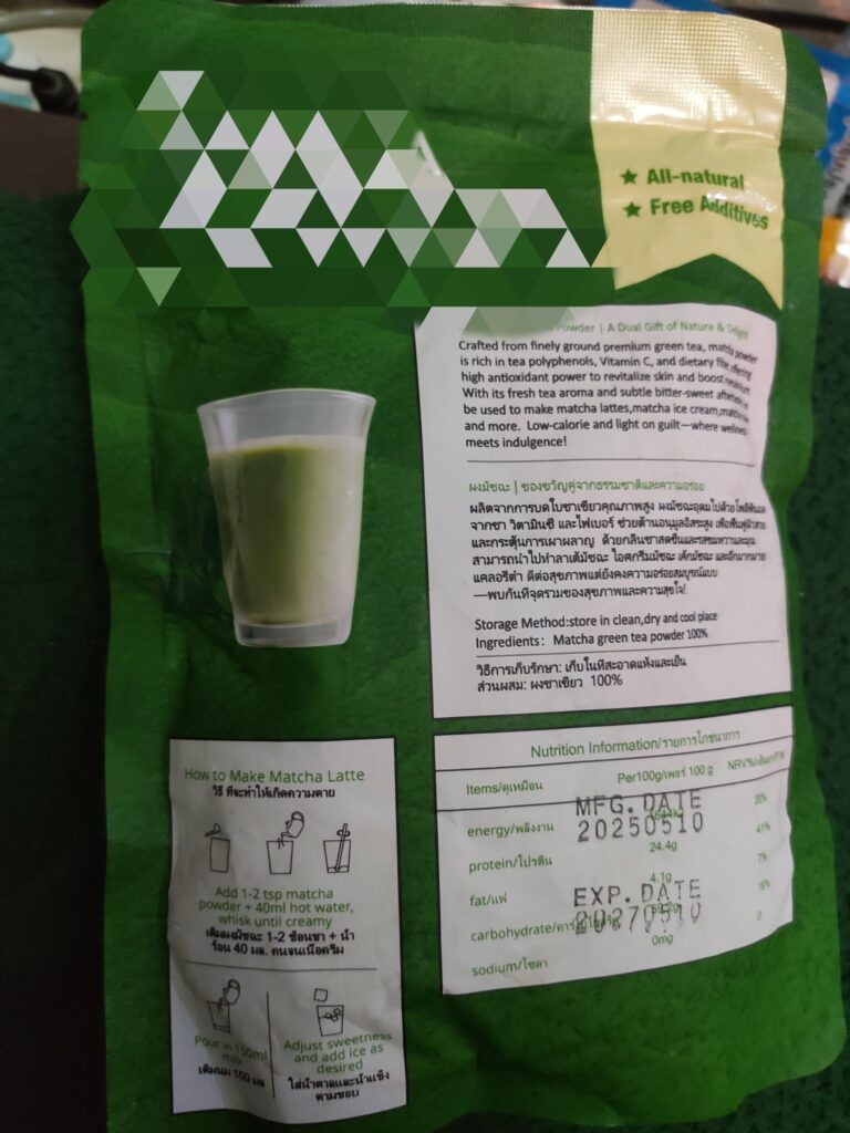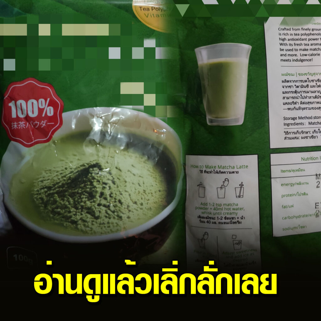 จากภาพเผยให้เห็นซองมัทฉะแบบผง หน้าซองมีภาษาอังกฤษและภาษาญี่ปุ่น ส่วนด้านหลังมีภาษาอังกฤษและภาษาไทย ซึ่งดูเผิน ๆ อาจจะดูไม่ผิดปกติอะไร