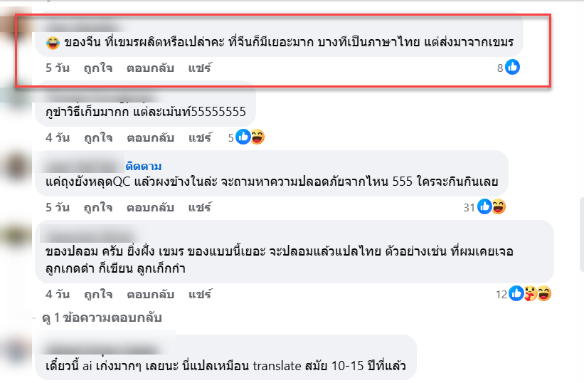 จากคลิปนี้ก็มีหลายคนเข้ามาแสดงความคิดเห็นกันอย่างมากมาย ทั้งบอกว่า “ของจีน ที่เขมรผลิตหรือเปล่าคะ ที่จีนก็มีเยอะมาก บางทีเป็นภาษาไทย แต่ส่งมาจากเขมร”