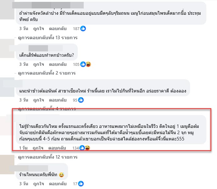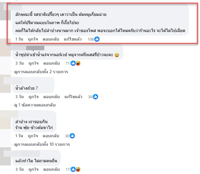 “ลักษณะนี้ รสชาติเปรี้ยวๆ เดาว่าเป็น ต้มหมูเกี่ยมฉ่าย แต่ให้ปริมาณแบบในภาพ ก็เxยไปนะ ผมก็ไม่ได้กลับไปลำปางนานมาก เจ้าของโพส พอจะบอกได้ไหมครับว่าร้านอะไร จะได้ไม่ไปเฉียด”