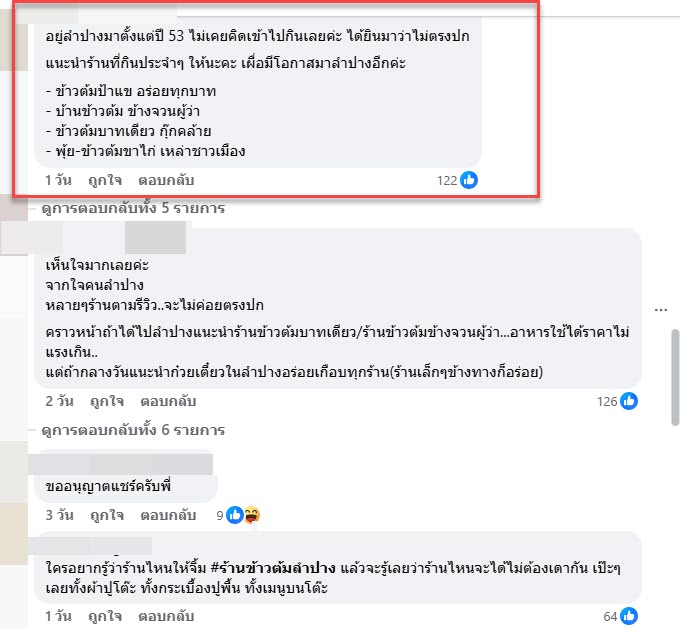 “อยู่ลำปางมาตั้งแต่ปี 53 ไม่เคยคิดเข้าไปกินเลยค่ะ ได้ยินมาว่าไม่ตรงปก แนะนำร้านที่กินประจำๆ ให้นะคะ เผื่อมีโอกาสมาลำปางอีกค่ะ – ข้าวต้มป้าแข อร่อยทุกบาท – บ้านข้าวต้ม ข้างจวนผู้ว่า – ข้าวต้มบาทเดียว กุ๊กคล้าย – พุ้ย-ข้าวต้มขาไก่ เหล่าชาวเมือง”