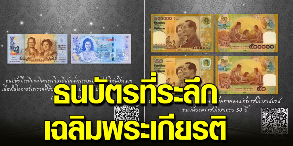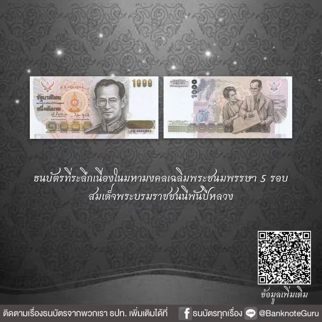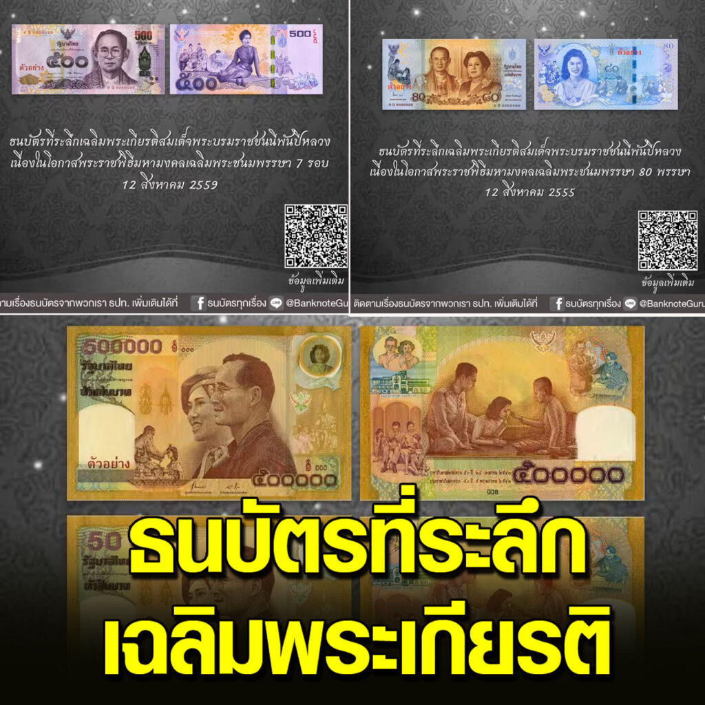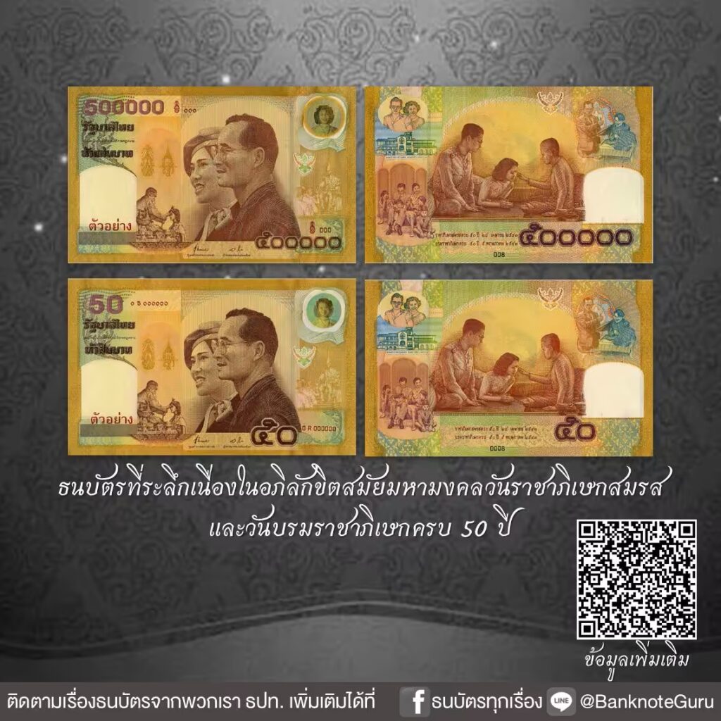 ธนบัตรที่ระลึกเนื่องในอภิลักขิตสมัยมหามงคลวันราชาภิเษกสมรส และวันบรมราชาภิเษกครบ 50 ปี เป็นครั้งแรกที่เชิญพระบรมฉายาสาทิสลักษณ์พระบาทสมเด็จ พระมหาภูมิพลอดุลยเดชมหาราช บรมนาถบพิตร เป็นภาพประธานด้านหน้าธนบัตรคู่กับพระฉายาสาทิสลักษณ์สมเด็จพระบรมราชชนนีพันปีหลวง รวมถึงดวงฟอยล์สีเหลืองทอง และลายน้ำ ก็เป็นพระบรมฉายาสาทิสลักษณ์และพระฉายาสาทิสลักษณ์ของทั้งสองพระองค์ด้วย ชนิดราคา 500000 บาทเป็นชนิดราคาที่สูงที่สุดของธนบัตรไทยที่เคยจัดพิมพ์
