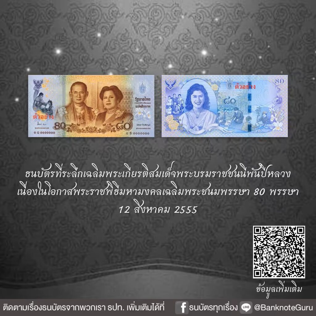 ลักษณะพิเศษ ลายน้ำเป็นอักษรพระนามาภิไธย “ส.ก.” ภายใต้พระมหามงกุฎ และแถบสีฟ้าฝังในเนื้อกระดาษ ภายในมีตัวเลข “80” และจะเปลี่ยนเป็น “รูปดอกกุหลาบ” เมื่อพลิกธนบัตรไปมา ซึ่งนำมาใช้เป็นครั้งแรกในธนบัตรไทย ขนาด : 8 X 16.20 เซนติเมตร ชนิดราคา 80 บาท จ่ายแลกในราคา 120 บาท พร้อมแผ่นพับ ประกาศออกใช้ : ลงวันที่ 15 มิถุนายน 2555วันออกใช้ : วันที่ 9 สิงหาคม 2555
