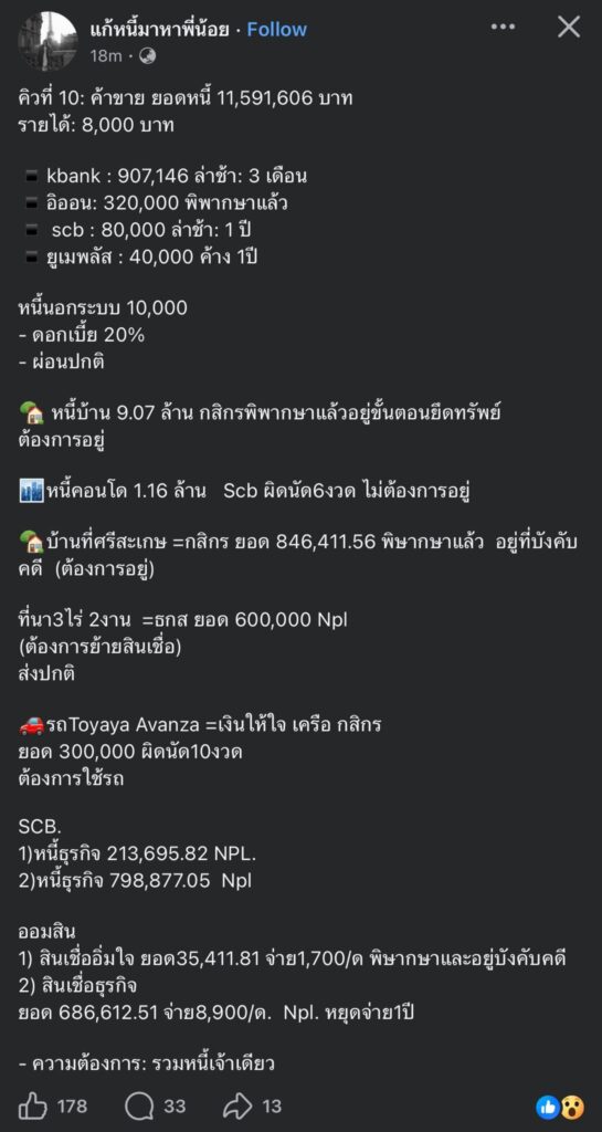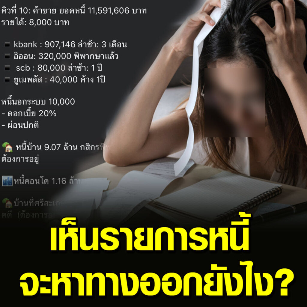 “คิวที่ 10: ค้าขาย ยอดหนี้ 11,591,606 บาท รายได้: 8,000 บาทconfirmed แล้ว 8,000 จริง เอาจริงๆ ไม่มีรายได้เลยตอนนี้ 8,000 นี่ กรอกไปงั้นๆ kbank : 907,146 ล่าช้า: 3 เดือนอิออน: 320,000 พิพากษาแล้ว scb : 80,000 ล่าช้า: 1 ปี ยูเมพลัส : 40,000 ค้าง 1ปี หนี้นอกระบบ 10,000 ดอกเบี้ย 20% ผ่อนปกติ
