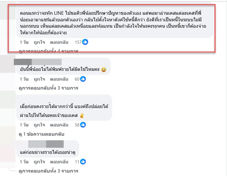 จากโพสต์นี้มีหลายคนเข้ามาแสดงความคิดเห็นกันอย่างมากมาย “ตอนแรกว่าจะทัก LINE ไปขอคิวพี่น้อยปรึกษาปัญหาของตัวเอง แต่พอมาอ่านเคสแต่ละเคสที่พี่น้อยเอามาแชร์แล้วบอกตัวเองว่า กลับไปตั้งใจหาตังค์ใช้หนี้ดีกว่า ยังดีที่เราเป็นหนี้ในระบบไม่มีนอกระบบ เห็นแต่ละเคสแล้วเหนื่อยและท้อแทน เป็นกำลังใจให้นะคะทุกคน เป็นหนี้เขาก็ต้องจ่ายให้มากให้น้อยก็ต้องจ่าย”