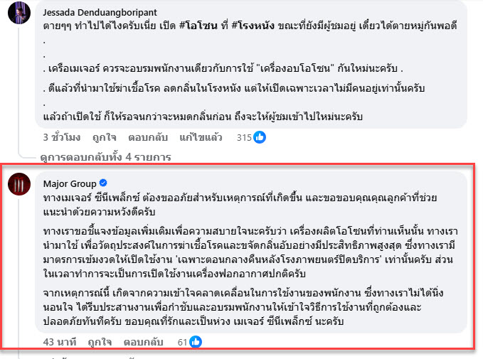 โดยจากในโพสต์นี้ทางเมเจอร์ได้เข้ามาคอมเมนต์ชี้แจงด้วยว่า “ทางเมเจอร์ ซีนีเพล็กซ์ ต้องขออภัยสำหรับเหตุการณ์ที่เกิดขึ้น และขอขอบคุณคุณลูกค้าที่ช่วยแนะนำด้วยความหวังดีครับ ทางเราขอชี้แจงข้อมูลเพิ่มเติมเพื่อความสบายใจนะครับว่า เครื่องผลิตโอโซนที่ท่านเห็นนั้น ทางเรานำมาใช้ เพื่อวัตถุประสงค์ในการฆ่าเชื้อโรคและขจัดกลิ่นอับอย่างมีประสิทธิภาพสูงสุด ซึ่งทางเรามีมาตรการเข้มงวดให้เปิดใช้งาน ‘เฉพาะตอนกลางคืนหลังโรงภาพยนตร์ปิดบริการ’ เท่านั้นครับ ส่วนในเวลาทำการจะเป็นการเปิดใช้งานเครื่องฟอกอากาศปกติครับ จากเหตุการณ์นี้ เกิดจากความเข้าใจคลาดเคลื่อนในการใช้งานของพนักงาน ซึ่งทางเราไม่ได้นิ่งนอนใจ ได้รีบประสานงานเพื่อกำชับและอบรมพนักงานให้เข้าใจวิธีการใช้งานที่ถูกต้องและปลอดภัยทันทีครับ ขอบคุณที่รักและเป็นห่วง เมเจอร์ ซีนีเพล็กซ์ นะครับ”
