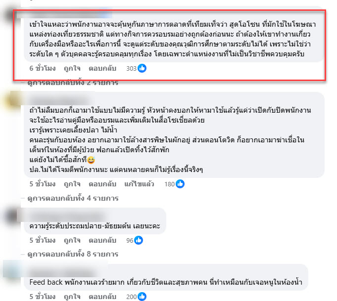 “เข้าใจแหละว่าพนักงานอาจจะคุ้นหูกันภาษาการตลาดที่เทียมเท็จว่า สูดโอโซน ที่มักใช้ในโฆษณาแหล่งท่องเที่ยวธรรมชาติ แต่ทางกิจการควรอบรมอย่างถูกต้องก่อนนะ ถ้าต้องให้เขาทำงานเกี่ยวกับเครื่องมือหรืออะไรเพื่อการนี้ จะดูแต่ระดับของคุณวุฒิการศึกษาตามระดับไม่ได้ เพราะไม่ใช่ว่าระดับใด ๆ ตัวบุคคลจะรู้ครอบคลุมทุกเรื่อง โดยเฉพาะตำแหน่งงานที่ไม่เป็นวิชาชีพควบคุมครับ”