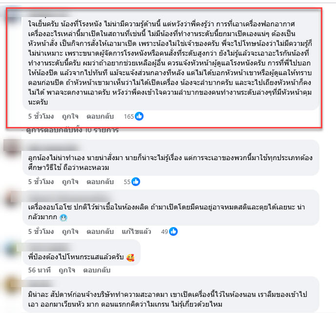 “ใจเย็นครับ น้องที่โรงหนัง ไม่น่ามีความรู้ด้านนี้ แต่หวังว่าพี่คงรู้ว่า การที่เอาเครื่องฟอกอากาศ เครื่องอะไรเหล่านี้มาเปิดในสถานที่เช่นนี้ ไม่มีน้องที่ทำงานระดับนี้ยกมาเปิดเองแน่ๆ ต้องเป็นหัวหน้าสั่ง เป็นกิจการสั่งให้เอามาเปิด เพราะน้องไม่ใช่เจ้าของครับ พี่จะไปโทษน้องว่าไม่มีความรู้ก็ไม่น่าเหมาะ เพราะขนาดผู้จัดการโรงหนังหรือคนสั่งที่ระดับสูงกว่า ยังไม่รู้แล้วจะเอาอะไรกันน้องที่ทำงานระดับนี้ครับ ผมว่าถ้าอยากช่วยเหลือผู้อื่น ควรแจ้งหัวหน้าผู้ดูแลโรงหนังครับ การที่พี่ไปบอกให้น้องปิด แล้วจากไปทันที แม้จะแจ้งส่วนกลางทีหลัง แต่ไม่ได้บอกหัวหน้าเขาหรือผู้ดูแลให้ทราบตอนก่อนปิด ถ้าหัวหน้าเขามาเห็นว่าไม่ได้เปิดเครื่อง น้องจะลำบากครับ และจะไปเถียงหัวหน้าก็คงไม่ได้ พาลจะตกงานเอาครับ หวังว่าพี่คงเข้าใจความลำบากของคนทำงานระดับล่างๆที่มีหัวหน้าคุมนะครับ”