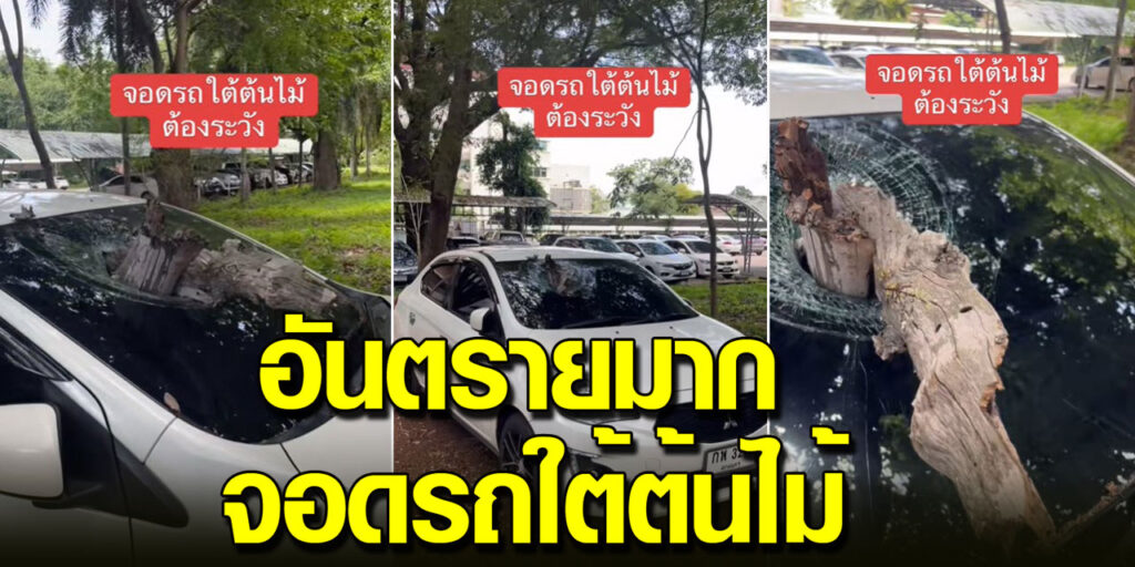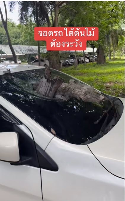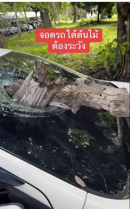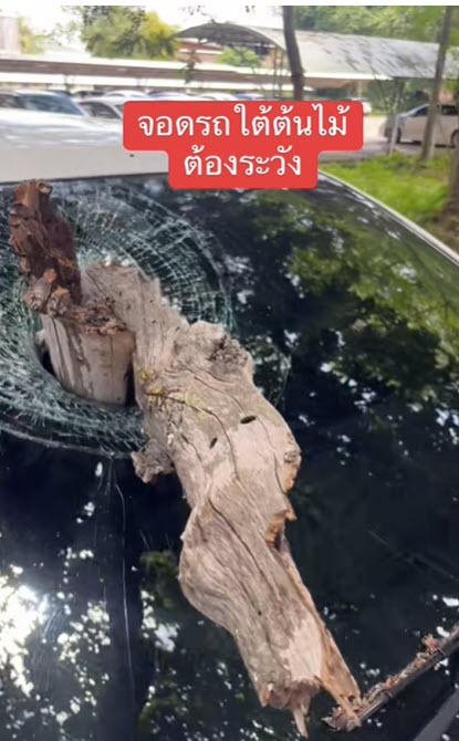 โดยจากในคลิปนั้นได้เผยให้เห็นว่ารถที่จอดไว้ใต้ต้นไม้ กลับมาเจอว่ามีกิ่งไม้ขนาดใหญ่ หล่นลงมาโดนกระจกรถจนแตกทะลุลงไป ซึ่งอันตรายมากๆ