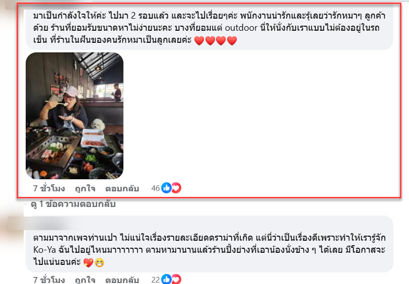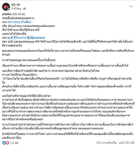 กลายเป็นอีกหนึ่งประเด็นที่ถูกพูดถึงกันอย่างมากมาย หลังจากมีคลิปที่ถูกแชร์ในโลกออนไลน์ เป็นคลิปที่ลูกค้า พาน้องหมาไปนั่งทานข้าวร่วมโต๊ะในร้านอาหาร ทำให้คลิปดังกล่าวป็นที่วิพากษ์วิจารณ์กันอย่างมากมาย ทั้งนี้ล่าสุดทางเพจ KO-YA ซึ่งเป็นเพจของร้านาอาหารดังกล่าวได้ออกมาชี้แจงถึงเรื่องนี้ว่า