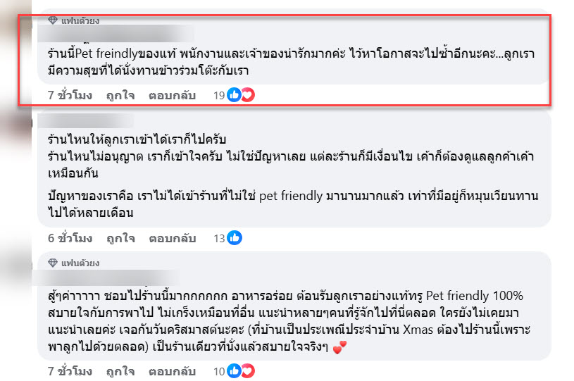 ซึ่งจากในคลิปนี้ก็มีหลายคนเข้ามาแสดงความคิดเห็นกันอย่างมากมาย “เคยไปแค่ครั้งเดียวค่ะ ถ้าไม่ติดว่าไกลบ้านจะไปบ่อยๆ ลูกชายนั่งด้วยได้โดยไม่ต้องอยู่ในกระเป๋าหรือรถเข็นเลยค่า pet-friendly ที่แท้ ร้านดูแลเรื่องความสะอาดดีมากๆเป็นกำลังใจให้น้า”