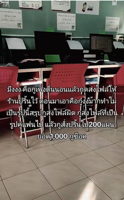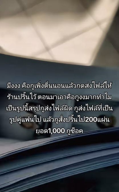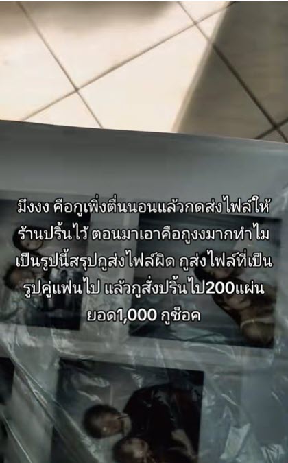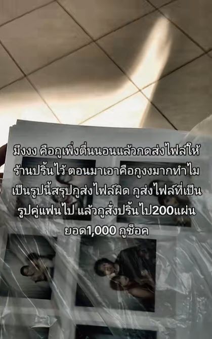 คือเพิ่งตื่นนอนแล้วกดส่งไฟล์ให้ร้านปริ้นไว้ ตอนมาเอาคืองงมาก ทำไมเป็นรูปนี้สรุปส่งไฟล์ผิด ส่งไฟล์ที่เป็นรูปคู่กับแฟนไป แล้วสั่งปริ้นไป 200 แผ่น ยอด 1,000 ช็อค