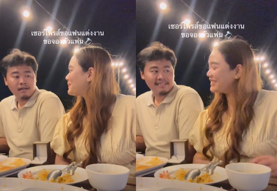 จากนั้นฝ่ายชายก็ยังมองไม่เห็นว่าสาวได้วางแหวนไว้ตรงหน้า เธอจึงชี้ให้เห็นแล้วเปิดกล่องแหวนยื่นให้ตรงหน้า ฝ่ายชายถึงกับชะงักและมีสีหน้าตกใจปนประหลาดใจพร้อมรอยยิ้มอย่างเห็นได้ชัด