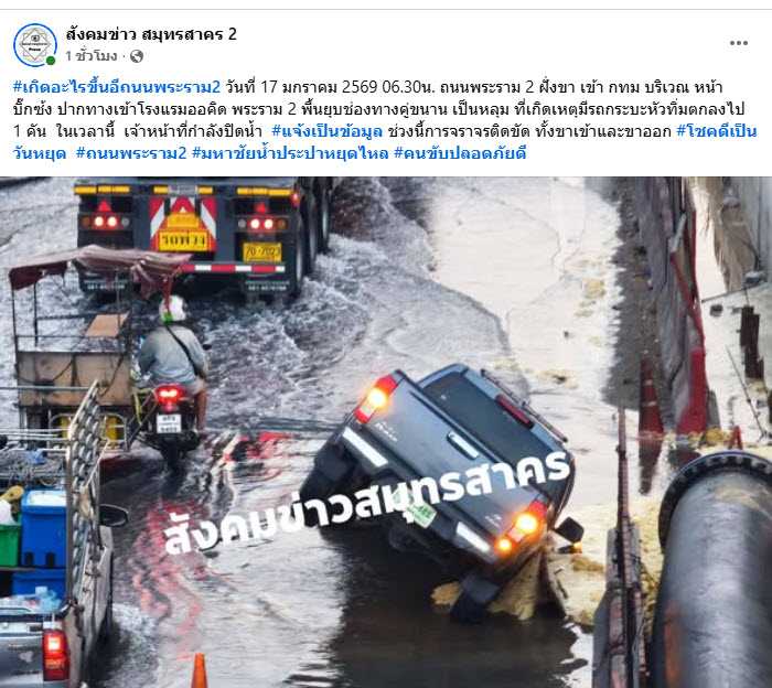 ต้องเรียกได้ว่าเป็นถนนที่สร้างเรื่องสุดๆ เมื่อมีรายงานว่าวันที่ 17 มกราคม 2569 เวลา 06.30 น. ถนนพระราม 2 ฝั่งขา เข้า กทม บริเวณ หน้าบิ๊กซ้ง พระราม 2 พื้นถนนยุบตัวช่องทางคู่ขนาน เป็นหลุม ขนาดเท่ากับรถกระบะ ที่เกิดเหตุมีรถกระบะหัวทิ่มตกลงไป 1 คัน ทำให้ช่องทางการจราจรเหลือเพียงเลนเดียว