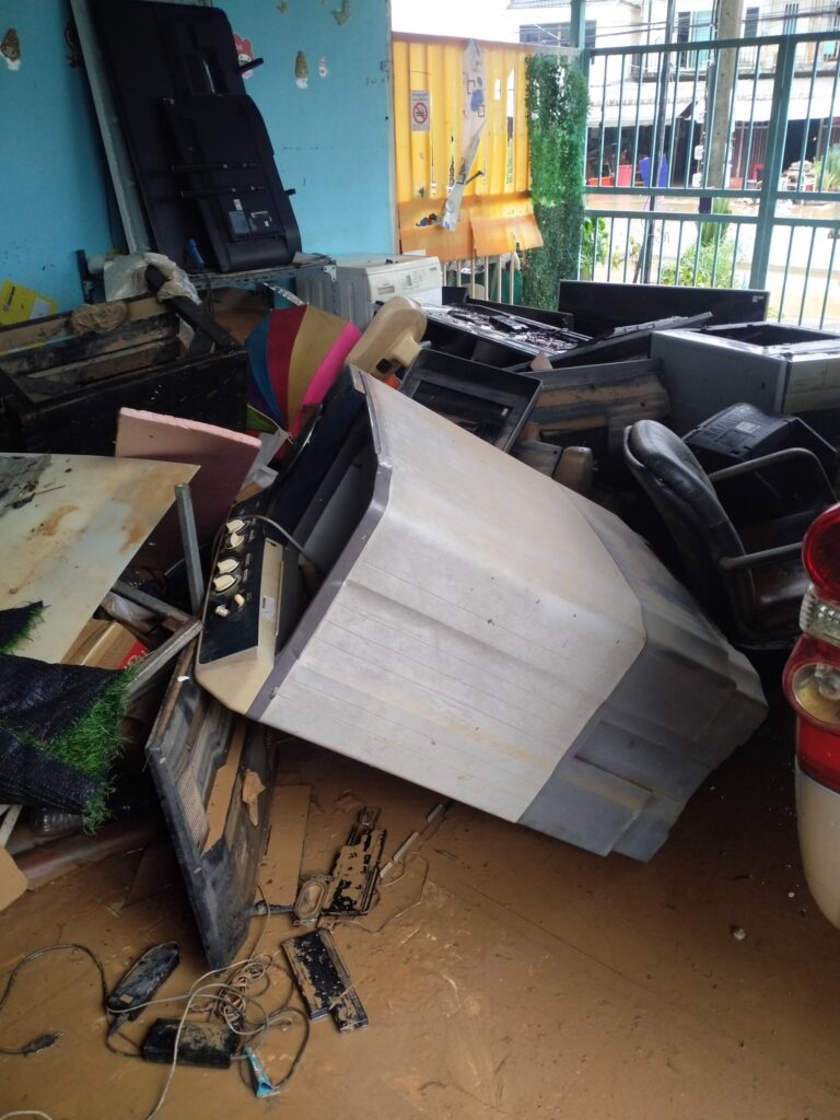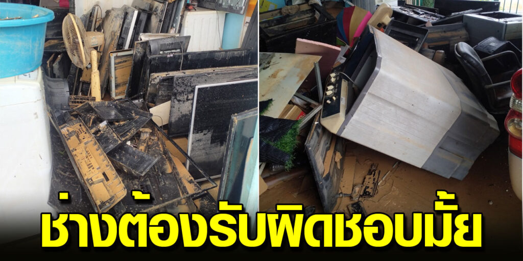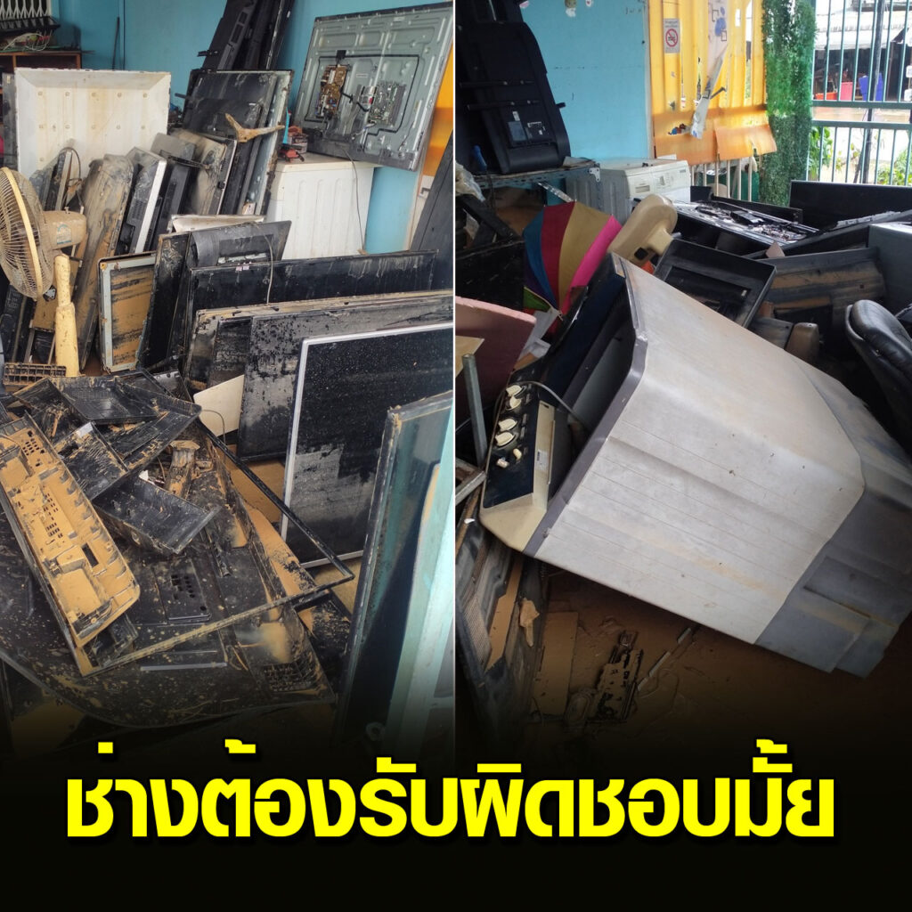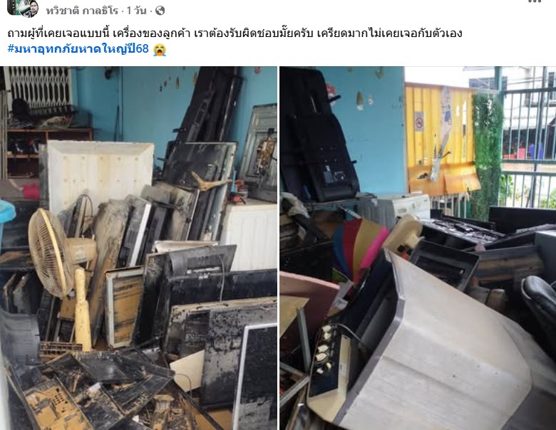 ได้เผยภาพความเสียหายพร้อมระบุว่า “ถามผู้ที่เคยเจอแบบนี้ เครื่องของลูกค้า เราต้องรับผิดชอบมั๊ยครับ เครียดมากไม่เคยเจอกับตัวเอง มหาอุทกภัยหาดใหญ่ปี68”