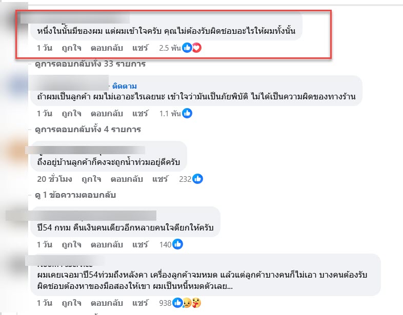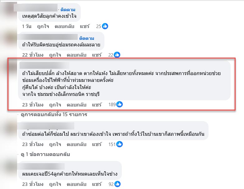 โดยจากในโพสต์นี้ก็มีหลายท่านเเข้ามาแสดงความคิดเห็น มีทั้งลูกค้าที่บอกว่าไม่ต้องรับผิดชอบเพราะเข้าใจ รวมทั้งมีคำแนะนำให้กับช่าง และเหตุอุทกภัยเป็นเหตุสุดวิสัย คงไม่ต้องรับผิดชอบ
