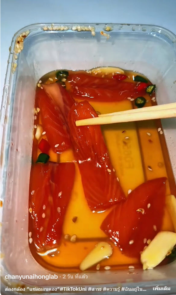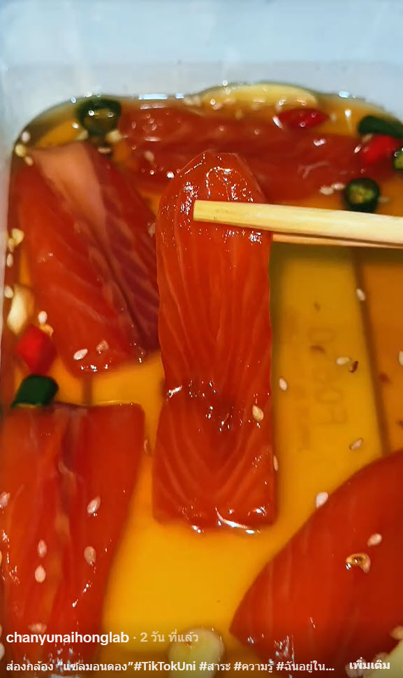 สำหรับคนที่ชอบกินแซลมอนดอง ก็คงจะเป็นกังวลในเรื่องความสะอาดหรือสุขอนามัยต่างๆ โดยล่าสุดที่บัญชีผู้ใช้ TikTok ที่ใช้ชื่อ @chanyunaihonglab ได้ออกมาโพสต์คลิปส่องกล้องแซลมอนดอง ที่ซื้อมาจากตลาดนัด กล่องละ 50 บาท