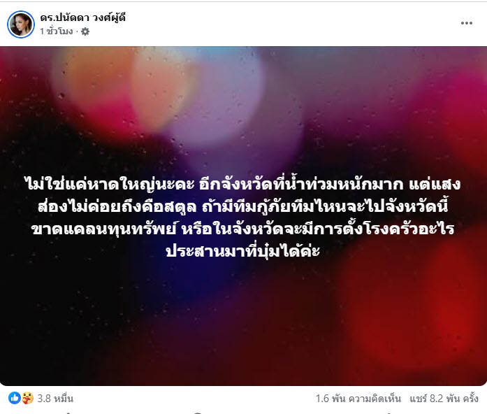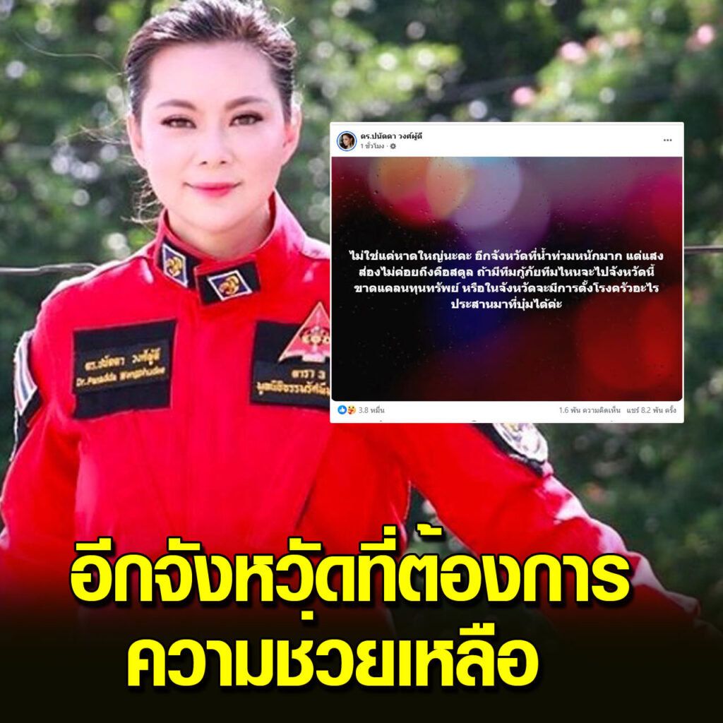 โดยล่าสุดทางเพจ ดร.ปนัดดา วงศ์ผู้ดี ของ บุ๋ม ปนัดดา ได้ออกมาโพสต์พร้อมเผยว่า “ไม่ใช่แค่หาดใหญ่นะคะ อีกจังหวัดที่น้ำท่วมหนักมาก แต่แสงส่องไม่ค่อยถึงคือสตูล ถ้ามีทีมกู้ภัยทีมไหนจะไปจังหวัดนี้ ขาดแคลนทุนทรัพย์ หรือในจังหวัดจะมีการตั้งโรงครัวอะไร ประสานมาที่บุ๋มได้ค่ะ”