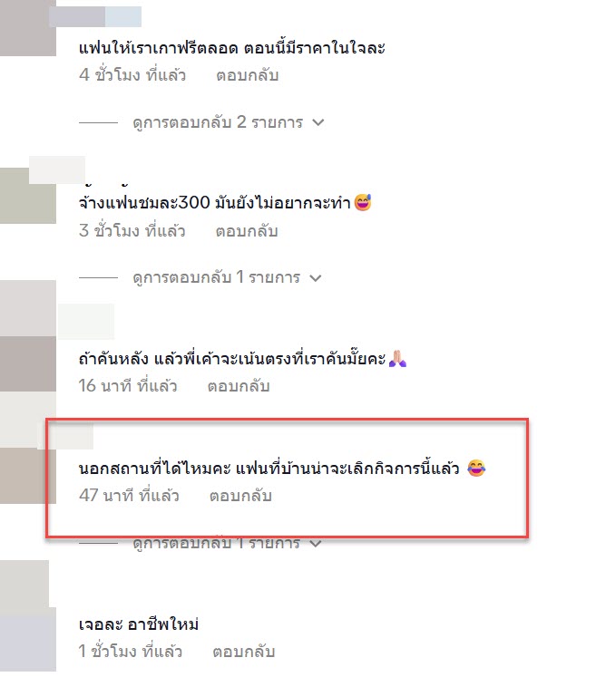 “นอกสถานที่ได้ไหมคะ แฟนที่บ้านน่าจะเลิกกิจการนี้แล้ว”