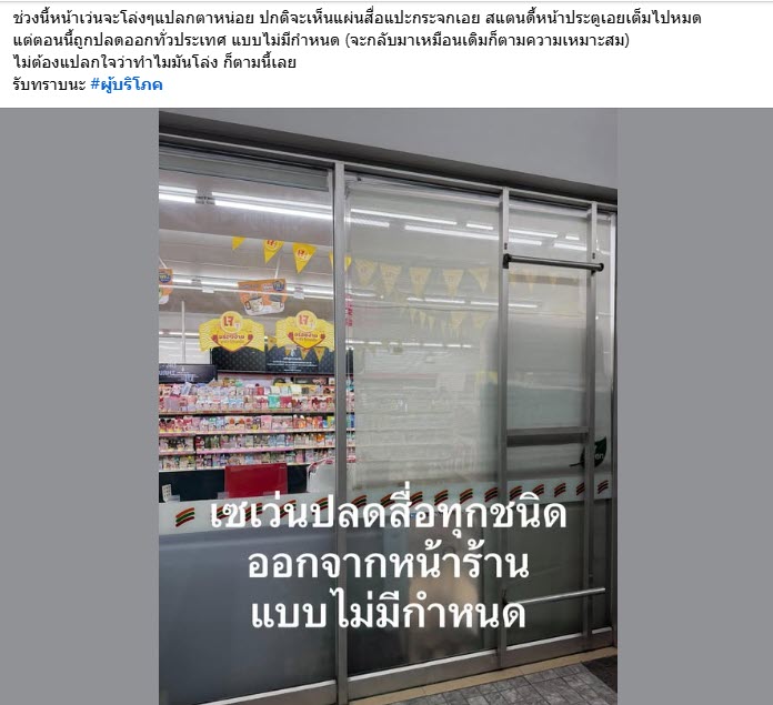 เป็นอีกหนึ่งเรื่องที่ทำเอาหลายคนสงสัยกันอย่างมาก เมื่อทาเพจ ผู้บริโภค ได้ออกมาโพสต์ภาพหน้าร้านเซเว่น ที่ช่วงนี้จะปลดป้ายโฆษณาออกจากหน้าร้าน โดยจากใคลิปนี้ได้เผยว่า