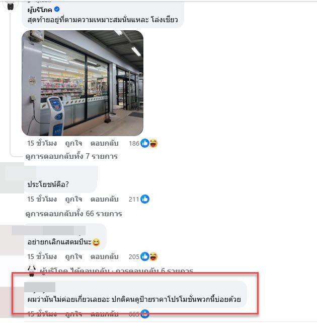 “เคยอ่านกันด้วยเหรอครับป้ายที่ติดตรงกระจก ผมว่ามันรก อีกอย่างที่จุดว่างสินค้าก็มีป้ายอยู่ ร้านเขาๆ จะทำอะไรก็ปล่อยเขาไปเถอะ อย่าดราม่าทุกเรื่องเลยครับ แค่ใช้ชีวิตก็เหนื่อยเกินพอแล้ว”