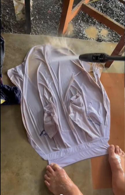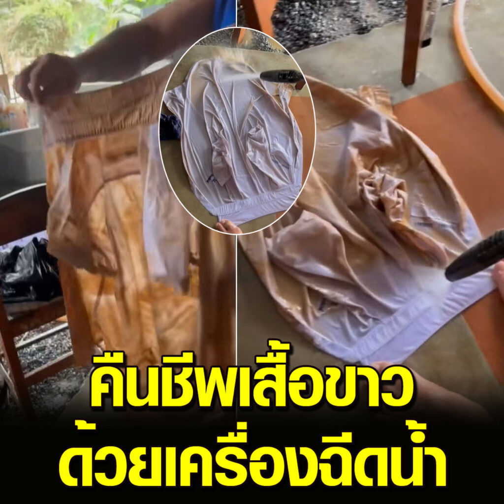 เสื้อขาวถูกน้ำท่วมจมโคลน ล้างทำความสะอาดด้วยเครื่องฉีดน้ำ