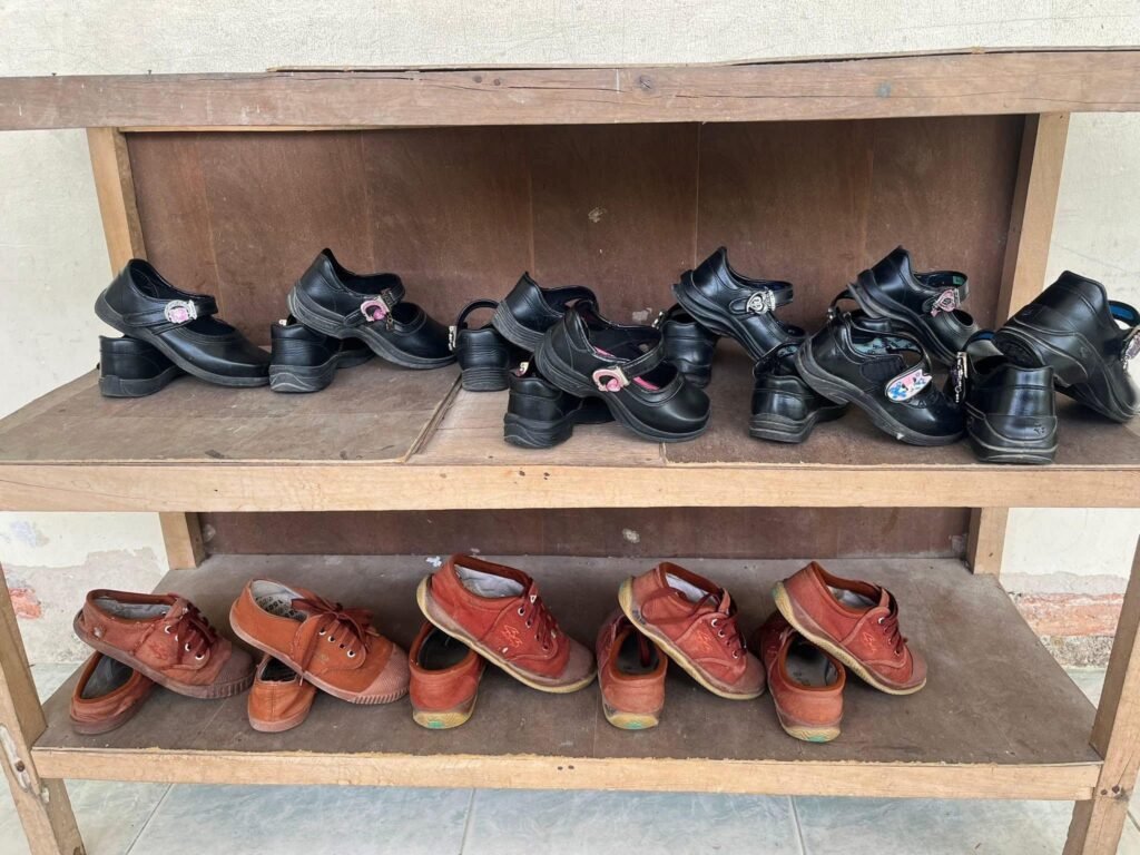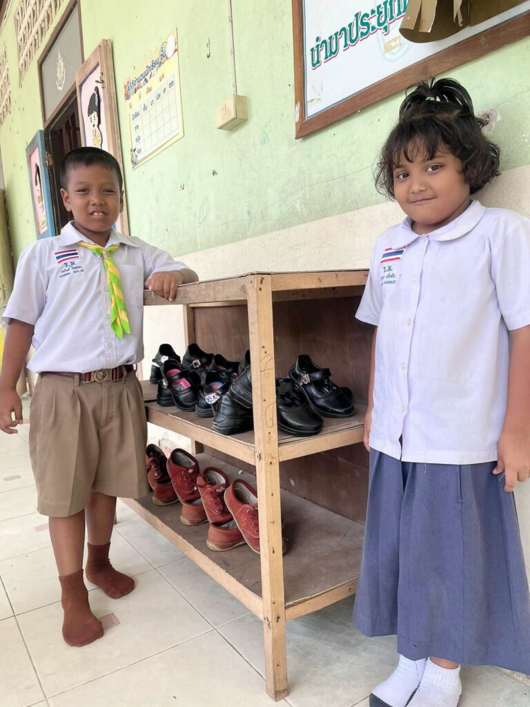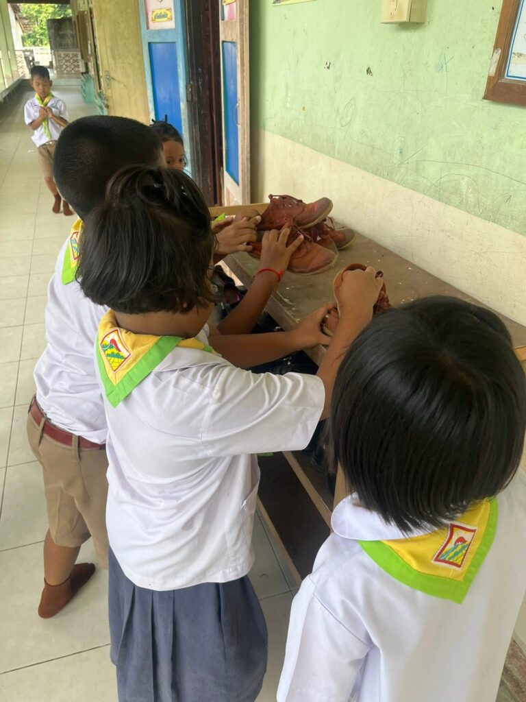 เด็กๆช่วยกันจัดเรียงรองเท้าให้เป็นระเบียบ