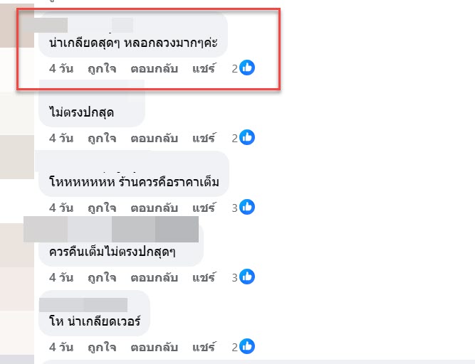 จากในโพสต์นี้ก็มีหลายคนเข้ามาแสดงความคิดเห็นกันอย่างมากมาย ทั้งยังบอกว่า ทำแบบนี้น่าเกลียดเกินไป เพราะรูปที่นำมาลงเป็นรูปจากในเน็ต แต่สินค้าจริงๆกลับทำไม่ได้ เลยทำให้ลูกค้าเสียความรู้สึก