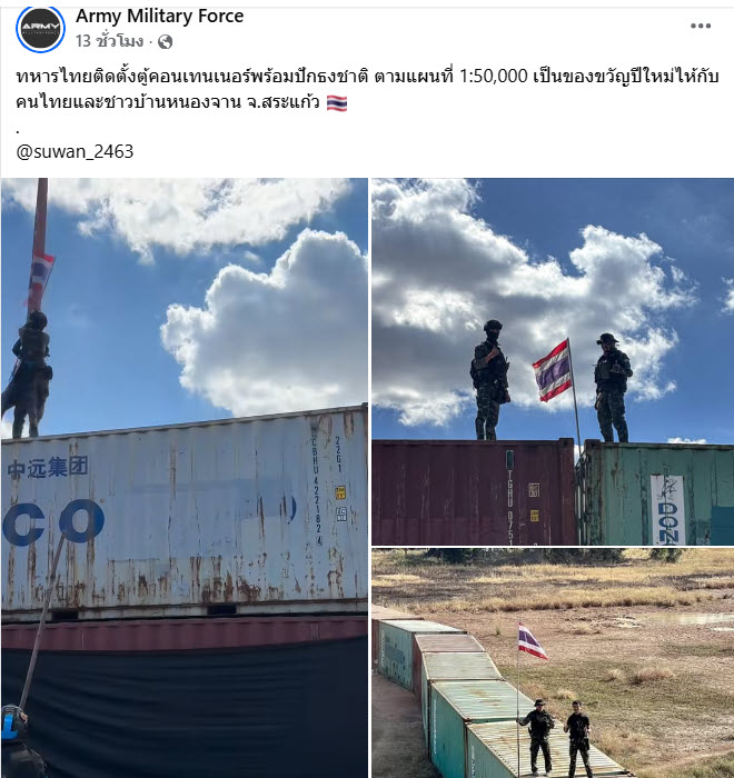 เป็นอีกหนึ่งโพสต์ที่ถูกแชร์กันออกไปอย่างมากมาย เมื่อทางเพจ Army Military Force ได้ออกมาโพต์ภาพของทหาร ที่ปักธงชาติไทยพร้อมระบุว่า “ทหารไทยติดตั้งตู้คอนเทนเนอร์พร้อมปักธงชาติ ตามแผนที่ 1:50,000 เป็นของขวัญปีใหม่ไห้กับคนไทยและชาวบ้านหนองจาน จ.สระแก้ว @suwan_2463”