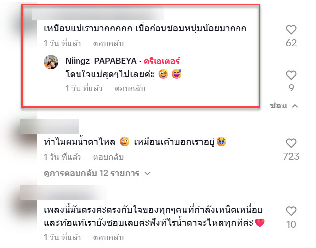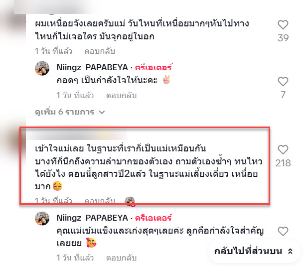 “เข้าใจแม่เลย ในฐานะที่เราก็เป็นแม่เหมือนกัน บางทีก็นึกถึงความลำบากของตัวเอง ถามตัวเองซ้ำๆ ทนไหวได้ยังไง ตอนนี้ลูกสาวปี2แล้ว ในฐานะแม่เลี้ยงเดี่ยว เหนื่อยมาก”