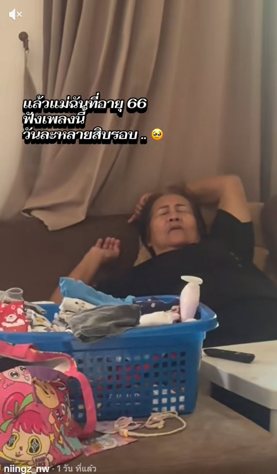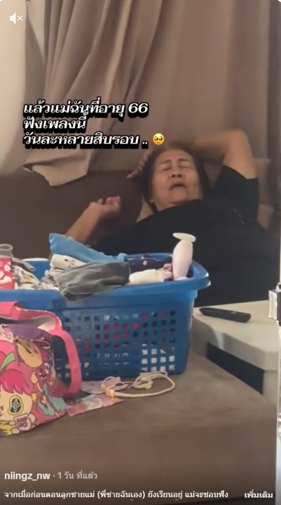 เชื่อว่าหลายๆคนก็คงจะมีเพลงโปรดที่ชอบเปิดฟังหลายๆรอบ เพราะเนื้อหาเพลงหรือทำนองที่โดนใจ ซึ่งล่าสุดบัญชีผู้ใช้ TikTok ที่ใช้ชื่อ @niingz_nw ได้ออกมาโพสต์คลิปพร้อมเผยว่า “จากเมื่อก่อนตอนลูกชายแม่ (พี่ชายฉันเอง) ยังเรียนอยู่ แม่จะชอบฟังเพลงหนุ่มน้อย เป็นร้อยรอบ … มาช่วงนี้ แม่ฟังเพลงนี้เป็นร้อยรอบ”