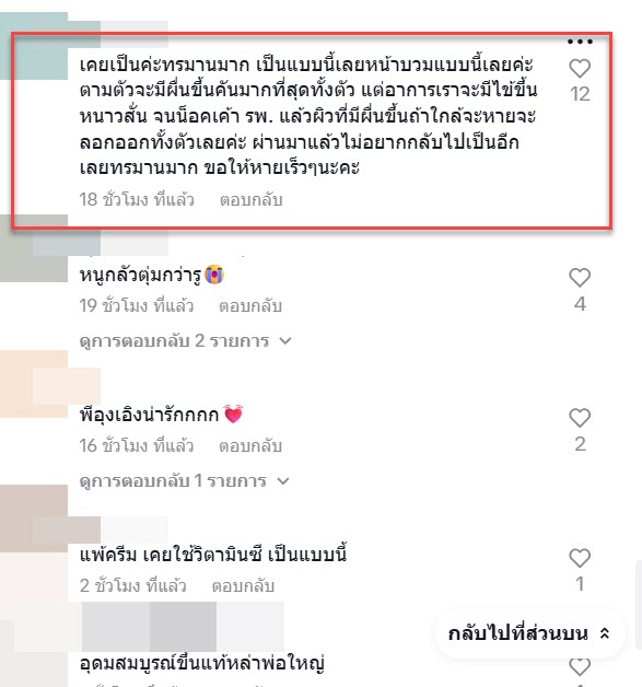 “เคยเป็นค่ะทรมานมาก เป็นแบบนี้เลยหน้าบวมแบบนี้เลยค่ะ ตามตัวจะมีผื่นขึ้นคันมากที่สุดทั้งตัว แต่อาการเราจะมีไข้ขึ้น หนาวสั่น จนน็อคเค้า รพ. แล้วผิวที่มีผื่นขึ้นถ้าใกล้จะหายจะลอกออกทั้งตัวเลยค่ะ ผ่านมาแล้วไม่อยากกลับไปเป็นอีกเลยทรมานมาก ขอให้หายเร็วๆนะคะ“