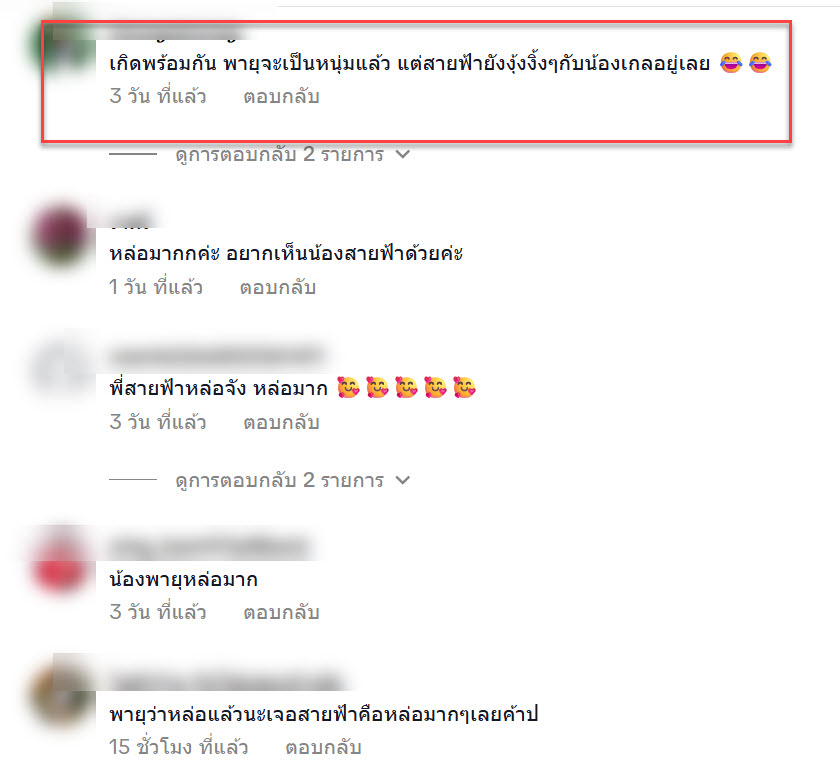จากคลิปนี้มีหลายคนเข้ามาแสดงความคิดเห็นกันอย่างมากมาย”เกิดพร้อมกัน พายุจะเป็นหนุ่มแล้ว แต่สายฟ้ายังงุ้งงิ้งๆกับน้องเกลอยู่เลย”