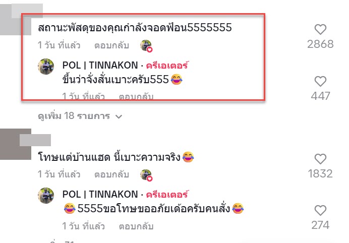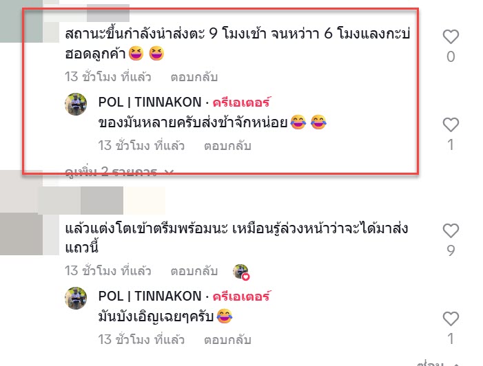 จากคลิปนี้ก็มีหลายคนเข้ามาแสดงความคิดเห็นกันอย่างมากมาย “สถานะพัสดุของคุณกำลังจอดฟ้อน5555555”