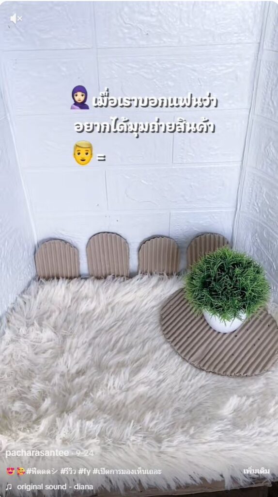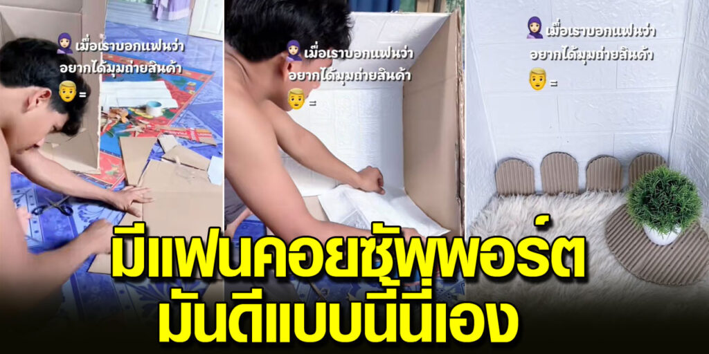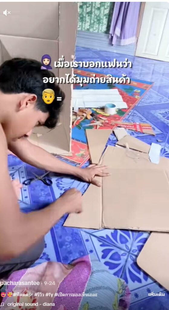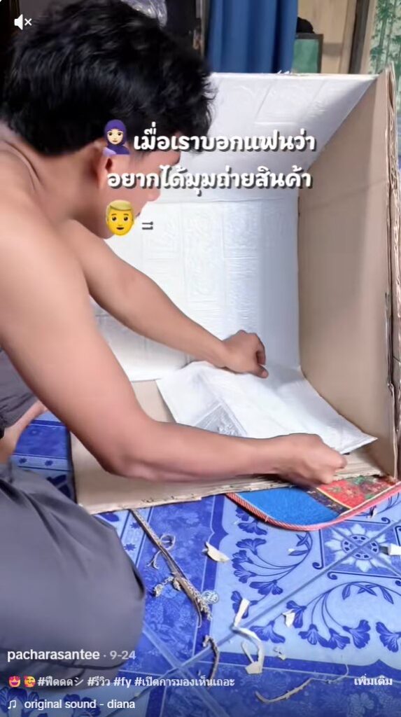 โดยจากในคลิปนั้นได้เผยให้เห็นว่า เจ้าของช่องที่ทำคลิปรีวิวสินค้า และให้แฟนทำมุมถ่ายคลิปรีวิวให้ โดยการนำเอาลังกระดาษมาทำ และตกแต่งให้สวยงาม แค่นี้ก็ได้มุมถ่ายภาพเล็กๆแล้ว