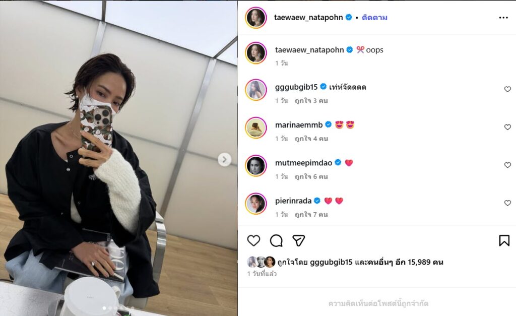 เป็นนางเอกสาวอีกคนทีต้องบอกเลยว่าตอนนี้เปลี่ยนลุคจากสาวหวานมาเป็นสาวเท่ไปแล้วสำหรับ แต้ว ณฐพร ที่ตอนนี้เปลี่ยนลุคใหม่ลงอินสตาแกรมส่วนตัว @taewaew_natapohn พร้อมแคปชั่น “oops” ให้แฟน ๆ ได้เซอร์ไพรส์กันอีกครั้ง
