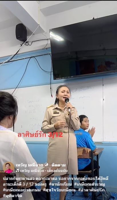 ต้องบอกเลยว่าไม่เสียชื่อคุณครูภาษาไทยจริงๆ เพราะคุณครูเสียงเพราะ และแต่งกลอนลำได้หวานซึ้งกินใจ เพื่อมอบให้เด็กๆ ในวันเกษียณอายุราชการ ถึงตัวจะต้องไกลแต่ความทรงจำดี ๆ ยังคงอยู่ตลอดไป