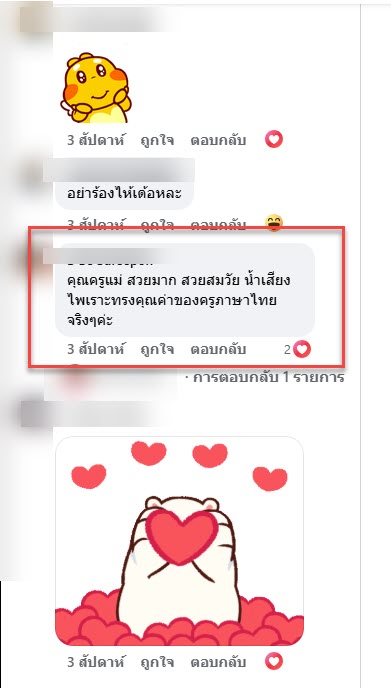 “คุณครูแม่ สวยมาก สวยสมวัย น้ำเสียงไพเราะทรงคุณค่าของครูภาษาไทยจริงๆค่ะ”