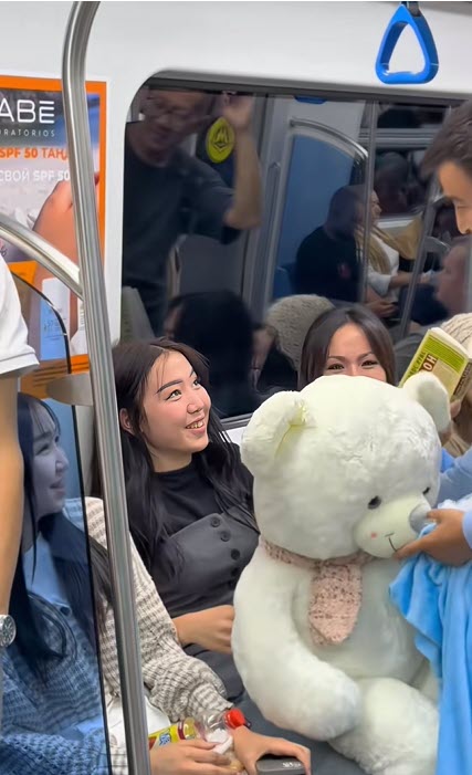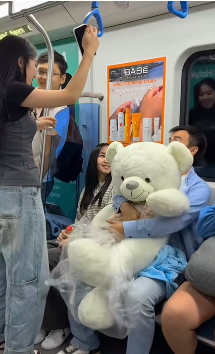จากคลิปนี้ได้เผยให้เห็นว่ามีหนุ่มคนหนึ่งอุ้มห่อผ้าที่เหมือนอุ้มเด็ก ขึ้นรถไฟฟ้าแล้วมีสาวคนหนึ่งเห็น เลยลุกให้นั่ง แต่พอแกะออกเป็นตุ๊กตาหมี เลยมอบให้เธอเป็นของขวัญแทนความใจดี
